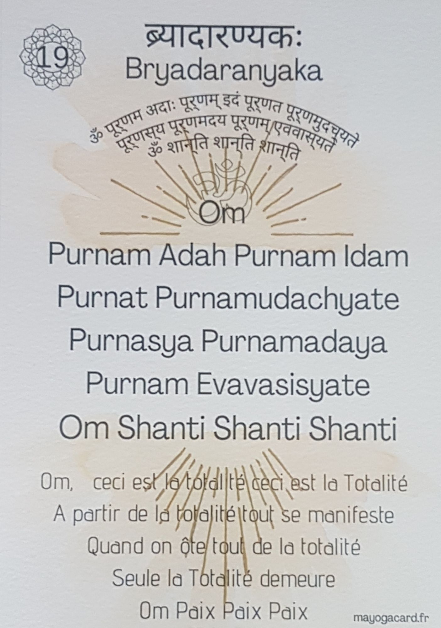 19- Om, Purnam Adah Purnam Idam, Purnat Purnamudachyate, Purnasya Purnamadaya, Purnam Evavasisyate, Om Shanti Shanti Shanti